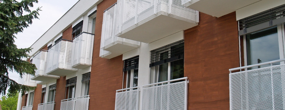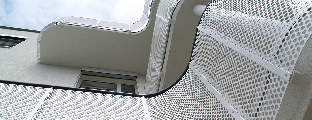 Választása az általunk ajánlott perforált lemzre esett. A kör lyukasztású Rv 20-28 -as perforált lemez minden téren megfelelt. Egyszerű, konzervatív hatást értünk el a horganyzott lemezek fehér színre festésével.