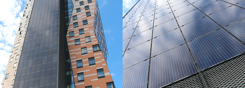 A homlokzat kerámiai burkolólapok és expandált lemezek kombinációja. Az anyagok megválasztásakor az építészek különös hangsúlyt fektettek a környezetbarát kialakításra.